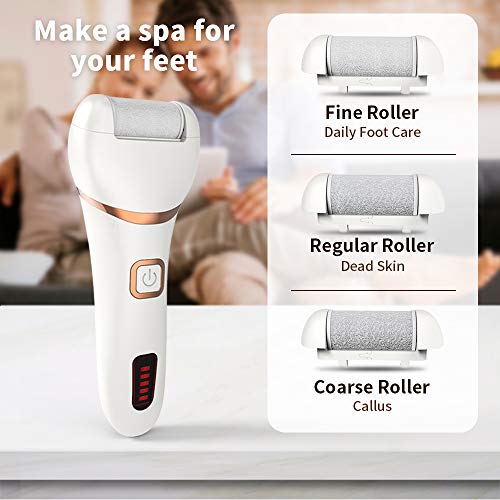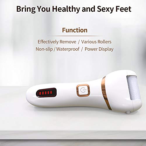 - 【Friendly Functional Design of Callus Remover】Our foot file brings a comfortable and safe experience, equipped with 3 roller heads and 2 speeds. 3 different Roller heads include 1 fine roller head, 1 regular roller head, and 1 coarse roller head for different callus conditions. Meanwhile, 2 speeds of 1700x/min and 2000x/min can be chosen according to foot condition. If the pressure is too strong, it will automatically protect and stop.