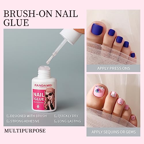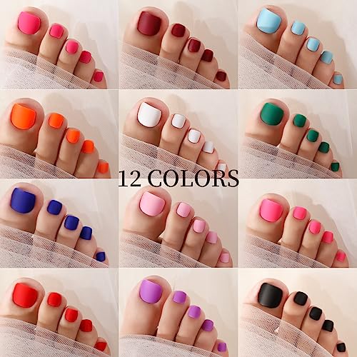 - Package Included: 288PCS matte press on toe nails and 7g nail glue. 12 solid matte colors: white, black, pink, baby blue, rose red, wine red, green, dark blue, orange, red, purple and bright pink. The colors are bright, beautiful and high saturation. After sticking the fake tor nails on your natural nails, it will not show your own nail color and shape. The fake nails are packed in a transparent plastic box with 12 grids. Each grid packed 1 color and 24pcs, total 12 color and 288pcs.