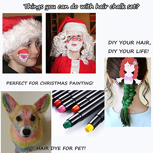 • 【Healthy and Eco-friendly Chalk Hair】- Safe, Non-allergenic and Water Soluble.The hair chalk is pretty harmless contrary to commercial hair dyes, non-toxic temporary hair colour chalk pens ,perfect for kids,girls , women,boys and men; won't cause any damage to the hair or skin if used both ways.