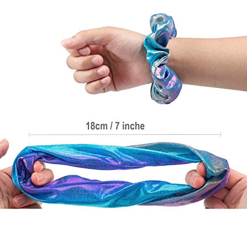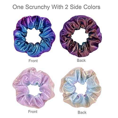 - 【Premium Material】 These scrunchy hair ties are made of shiny /sparkle Polyester printed fabric and durable elastic bands; good texture, the metallic scrunchies are shiny, comfortable and fashionable, each hair band with a durable rubber band, can fix your hair well and will not hurt your hair, easy and soft to wear