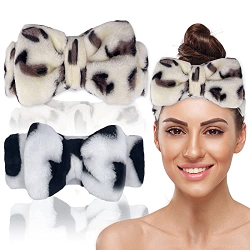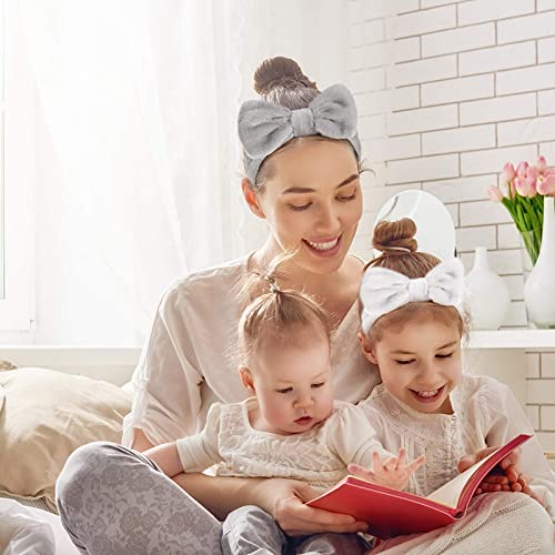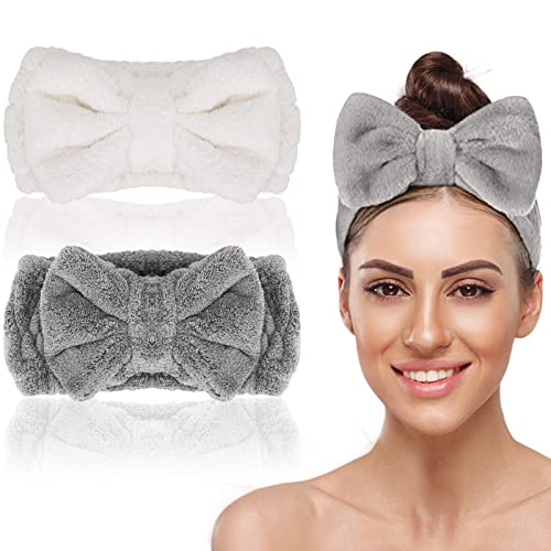 2 Pack Bowknot Spa Headband, Soft Coral Fleece Facial Makeup Hair Wrap Makeup Fluffy Headband for Women Girls Washing Face Skincare, White and Gr