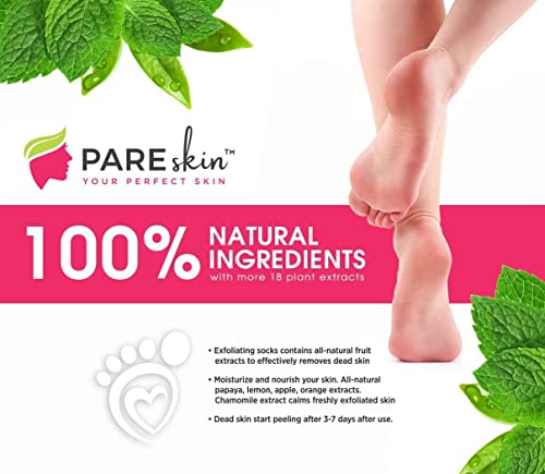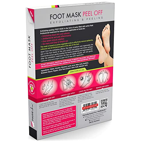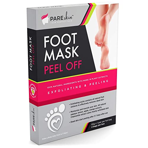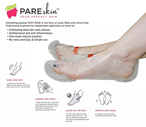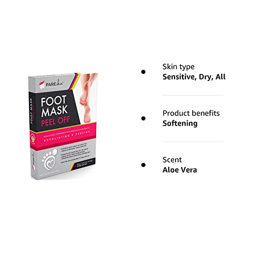 - [GET RID OF CALLUS, DRY AND DAMAGED FEET]: This foot mask will help work the dead skin and calluses off dry and hardened skin. It is gentle while being tough on unwanted and unsightly hardened skin patches. With aloe Aloe Vera extracts and Papain, PAREskin’s foot mask will get your feet peeling painlessly like never before.