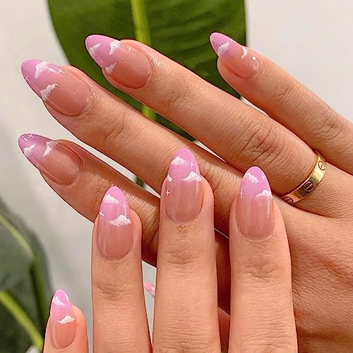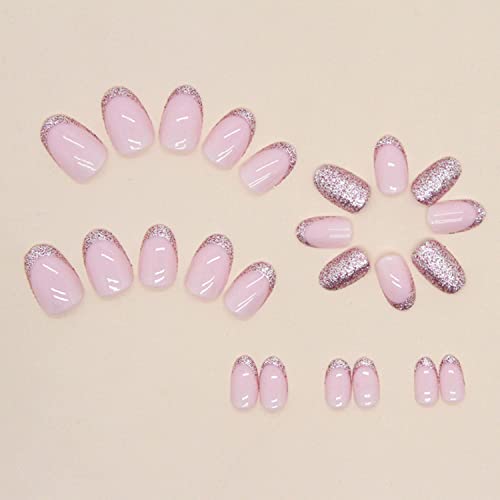 24Pcs Almond Press on Nails Short, French Tip Fake Nails Glossy Pink Glitter False Nails with Glue Stickers, Oval Acrylic Full Cover Glue on Nail