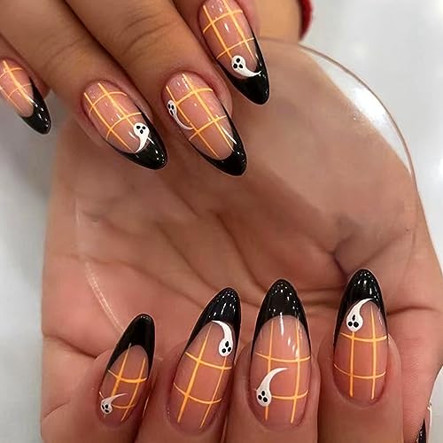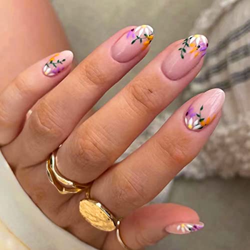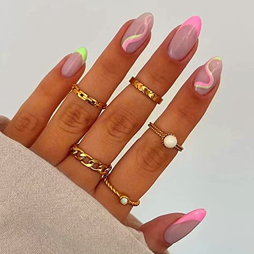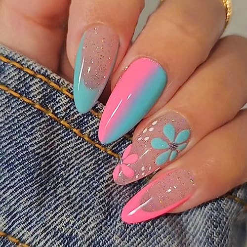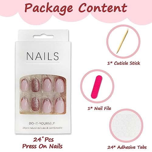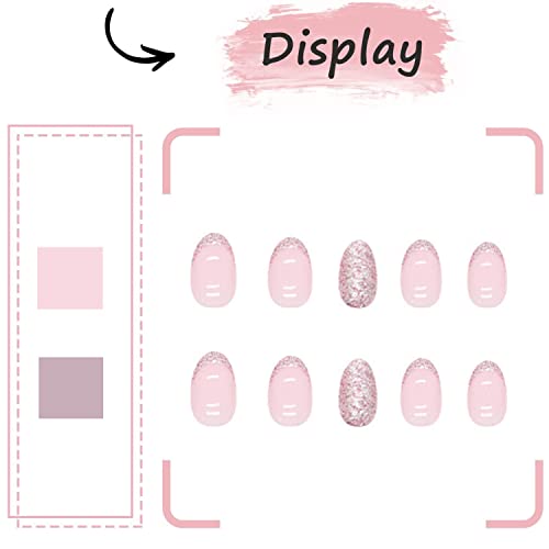 Home Nail Care 24Pcs Almond Press on Nails Short, French Tip Fake Nails Glossy Pink Glitter False Nails with Glue Stickers, Oval Acrylic Full Cover Glue on Nail