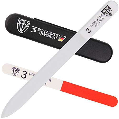 - CONTENTS: Glass nail file, 1 piece (11,5 cm) + 3-way nail buffer + black plastic case for safe, hygienic, clean and comfortable transport (length 14,0 cm)