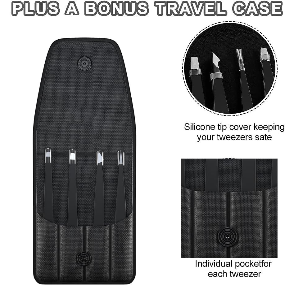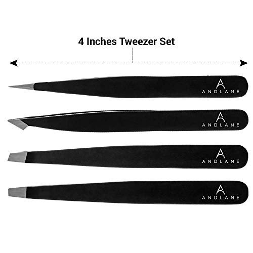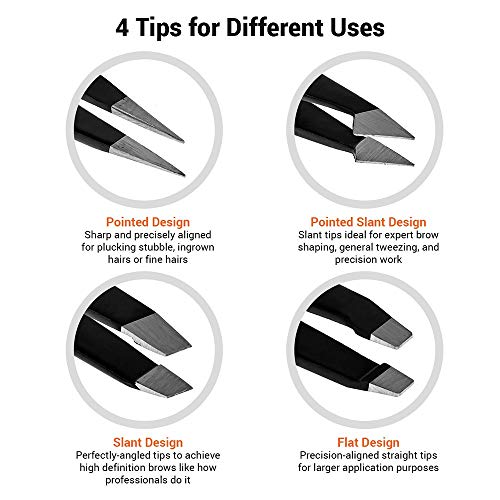 - MULTI-PURPOSE: : 4 in 1 Stainless Steel Tweezers Set includes flat, slant, pointed, and pointed slant tweezers, to shape eyebrows and remove ingrown hairs.