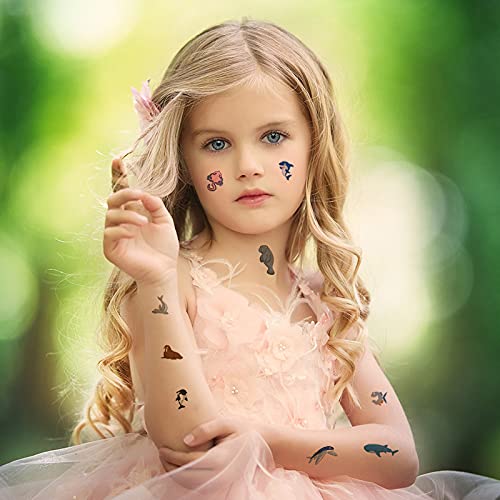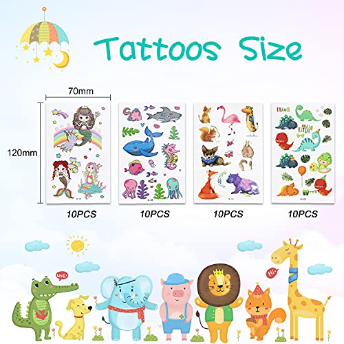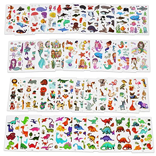 - ❤【Temporary Tattoos Includes】- Transfer tattoos for children, you will receive 40 sheets kids temporary tattoos set, including 10 sheets of dinosaur temporary tattoo paper, 10 sheets of underwater world fake tattoos for kids, 10 sheets of cartoon animals kids tattoos, 10 sheets of mermaid girls tattoos for kids, OVER 500 colorful designs. Multiple creative combinations and options to meet your different needs