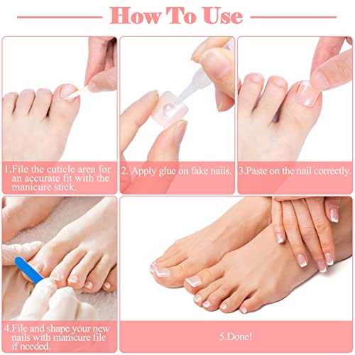 - Easy to Apply - Use these equipped nail files and cuticle pushers to clean your nail, then use strong glue to apply these stick-on toenails. It can last a long time without falling off easily.