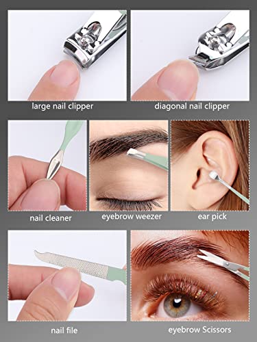 - 💅 Multifunctional: Our portable grooming kit are very versatile, for example, flat nail clipper, diagonal nail clipper, nail file, nail cleaner can be used for hand and foot care, eyebrow tweezers, eyebrow scissor, ear clip can be used for facial care.