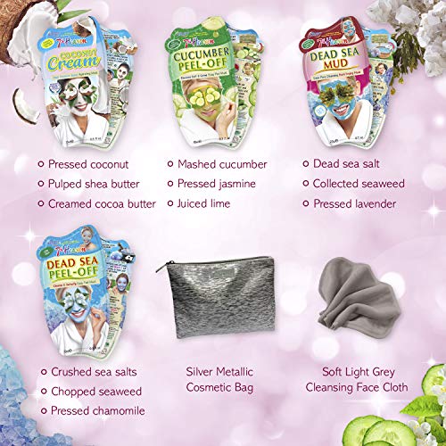 7th Heaven 'Pamper and Party' Face Mask Gift Set - 10 Moisturising and Cleansing Beauty Skin Care Masks, Silver Cosmetic Bag and Soft Cleansing F