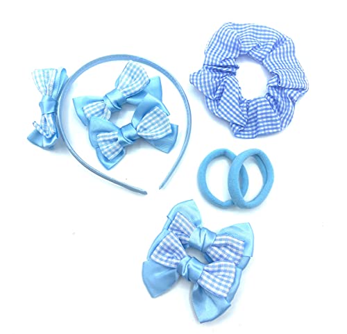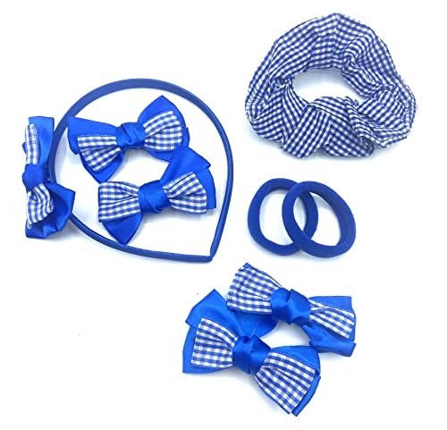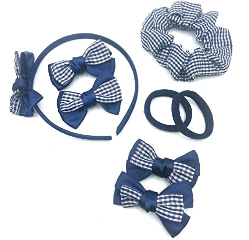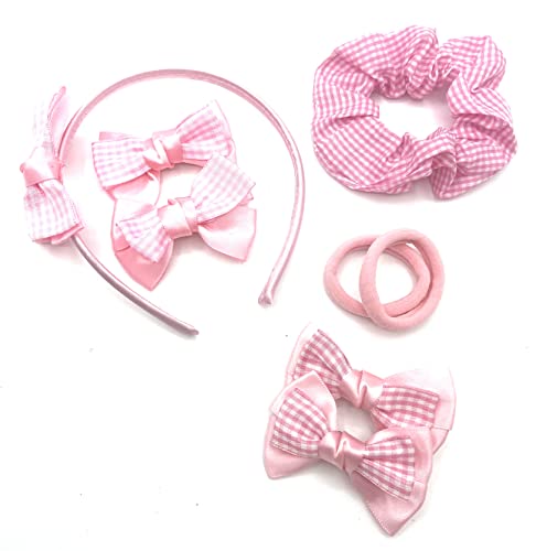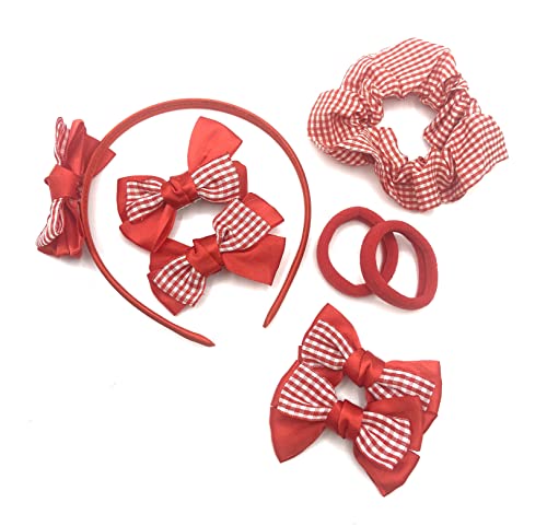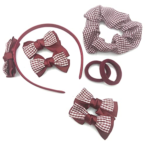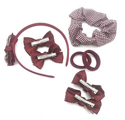 8 Piece Girls Gingham Hair School Set, Bow Clips Headbands, Hair Accessories for School, Scrunchies (Burgundy)