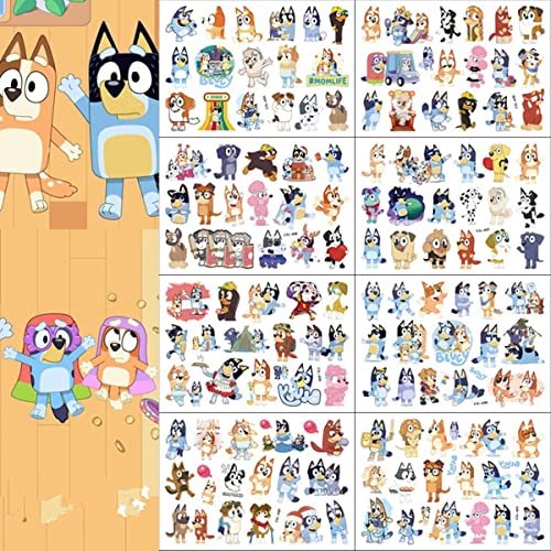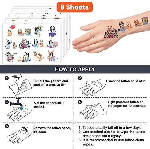 - Quality and Quantity: 8 Sheets Blue tattoos stickers, each pattern measures 6.1 * 3.1 inch, one size fit all adult and kids, cute cartoon style design create more fun in the party! Popular hit with your kids. You can apply them to your body or some smooth objects, for example, glass, stationery, paper, crafts cups, cabinet, bottle.