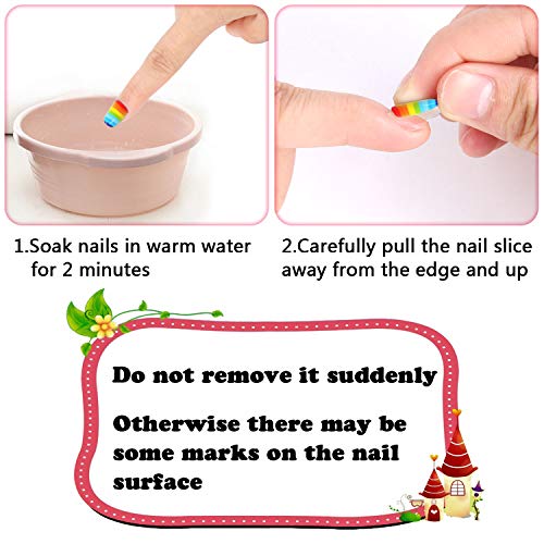 - TIPS FOR REMOVAL - Place the nails in warm water for 2 minutes to remove false nails more easily. Do not remove it suddenly, otherwise it may leave some marks on the nail surface. In this case, you can also wash the residue with water.