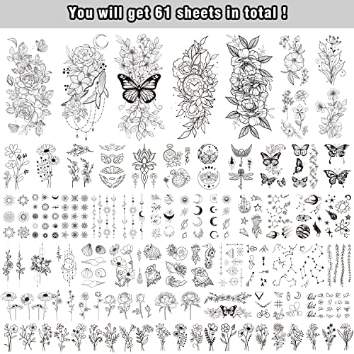 - 【Packaging & Size】A total of 61 sheets temporary tattoos with unique and beautiful designs in one set. Size: 5 sheets: 7.48 x 3.77 inch (19 x 9.6 cm), 56 sheets: 3.77 x 2.28 inch (9.6 x 5.8 cm).