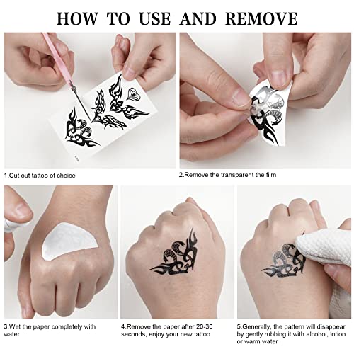 - 【EASY TO USE AND REMOVE】Without any glue, tear off the transparent layer, stick it on your arm, moisten it with water, and wait for 20-30 seconds. Just soak the tattoo in baby oil or olive oil and it will be removed after a few minutes. Waterproof and long lasting, it can stay on the skin for 3 to 5 days.