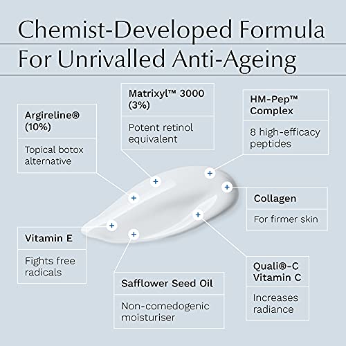 - Rapid anti-ageing with HM-PEP technology: Our unique combination of eight high-efficacy peptides & Retinol alternative MATRIXYL 3000 works synergistically to restore Collagen & Elastin. Unlike regular brands, we nano-emulsify for Superior Transdermal Delivery, shielded from light, air & oxygen by our FrostProtect tub.
