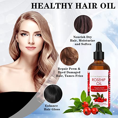 - ALSO FOR HAIR AND NAILS: Cold pressed rosehip oil fight dandruff, and hydrates dry, flaky scalp; it adds shine, bounce and silkiness back to colored hair, permed hair, or hair that has been damaged by too much sun or cold weather. Rose hip oil is also great for nails, helps to repair damaged and cracked nails.