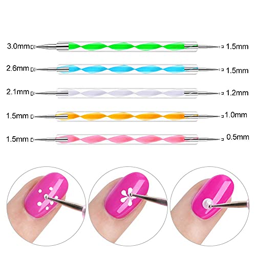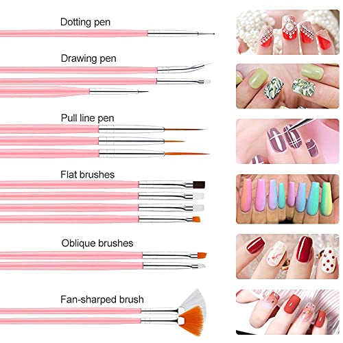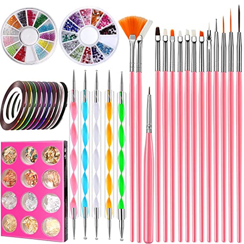 - 💘【Nail art kit】Come with 15pcs nail art design brush set, 5pcs nail art 2-ways drawing dotting painting pens, 2 boxes nail-art rhinestones, 12 pots paillette foil sticker in 4 colors and 10pcs assorted colors nail striping tapes.meets all you need for perfect nail art.