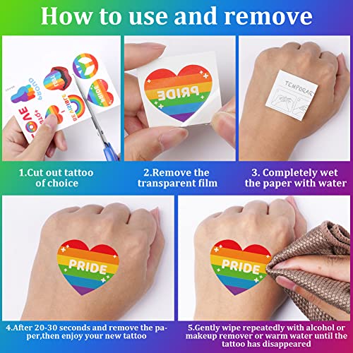- 【EASY TO USE AND REMOVE】Cut out the target LGBT tattoo, place the tattoo design face down on the skin, fully wet the back of the tattoo, remove the backing paper, and you will have the perfect pride temporary tattoo! You can use makeup remover, body lotion, baby oil, olive oil to cleanse.