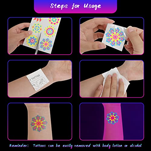 - 【Easy to Use】Glitter fluorescent tattoo stickers will last for days and maintain a beautiful appearance, waterproof design, not easy to fade, can be wiped with body lotion or BB oil until it disappears completely, or use alcohol to remove tattoo patterns in time
