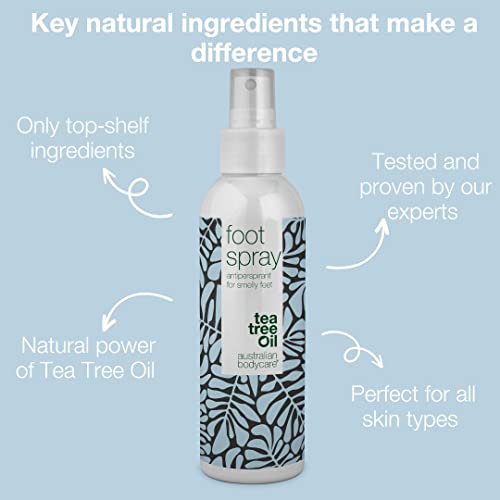 - 🌿 PRODUCT INFO: Australian Bodycare Foot Spray is an antitranspirant that contains 100% natural Australian Tea Tree Oil of pharmaceutical quality. the foot deodorant is specially formulated to keep your feet fresh, dry and comfortable all day long. Every single natural active ingredient was carefully selected for each foot product. All products from Australian Bodycare are dermatologically tested and 100% vegan.