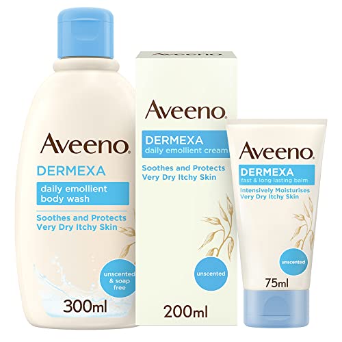 - Bundle contains 1X Aveeno Dermexa Daily Emollient Body Wash 300ml, 1X Aveeno Dermexa Daily Emollient Cream 200ml, and 1X Aveeno Dermexa Fast and Long Lasting Balm 75ml
