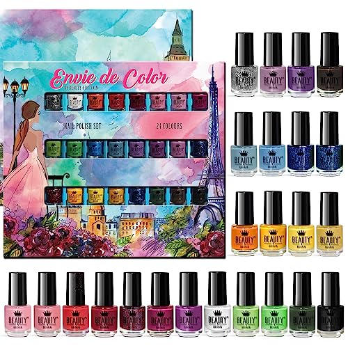 - Set of 48 Different Classic, Bright, Pearl and Glitter Colours. Collection inspired by the world's top fashion destinations - England, France and Italy. The set includes and white, black and top coat.