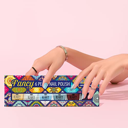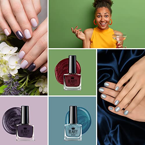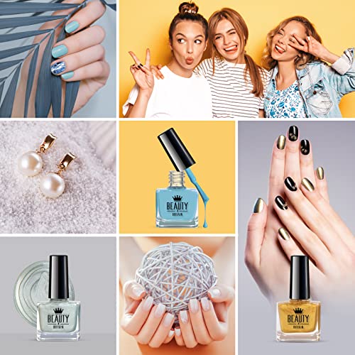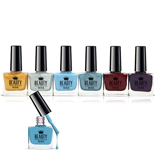 - High quality nail polish manufactured and packed in the E.U. One bottle is 10 ml. Colours included: Indigo Purple, Baby Blue, Finest Gold Powder, Ruby Red, Arctic Blue and Silver Steel.