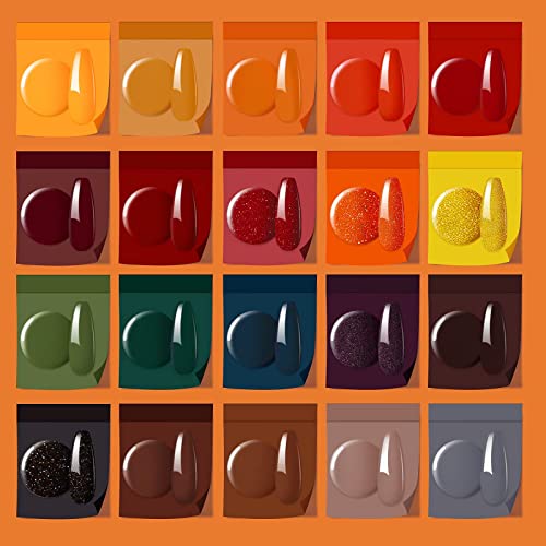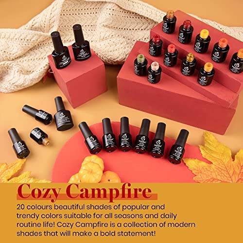 - DIY Home Mani Gel Nail Polish Kit: 20 fall winter colors as well as the base coat matte glossy gel top all in one box! This “Cozy Campfire” fall autumn winter gel nail polish set includes every must have color! An array of every shade you’ll need such as yellow orange red green glitter gel nail polish fall colors. Our color range will match any outfit you style your nails with in this fall winter!