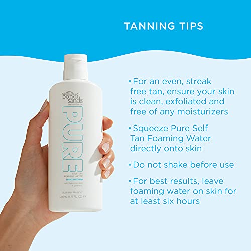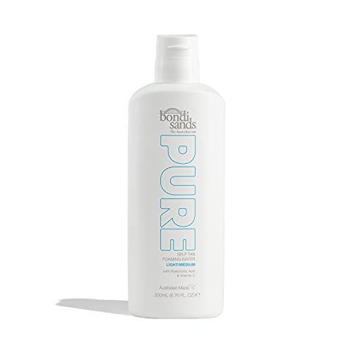 - ABOUT THE PRODUCT: Self-tanning goes clean & sustainable - discover the new way to self tan! Bondi Sands PURE Light/Medium Self-Tanning Foaming Water combines our iconic golden glow with skincare-first ingredients like Hyaluronic Acid for hydration, Vitamin C for radiance, and Vitamin E for rejuvenation. The colorless, fragrance free formula is quick drying, requires no rinse off, and is gentle enough for sensitive skin.