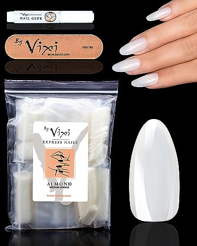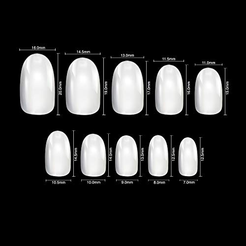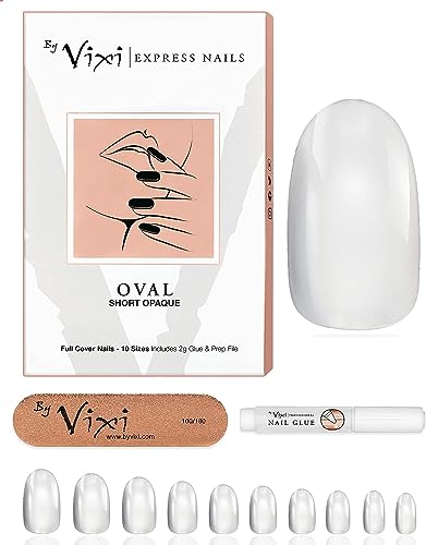 By Vixi 600 SHORT OVAL NAIL SET with FREE GLUE & PREP FILE, 10 Sizes – Opaque Express Full Cover False Fingernail Extensions for Salon Profession