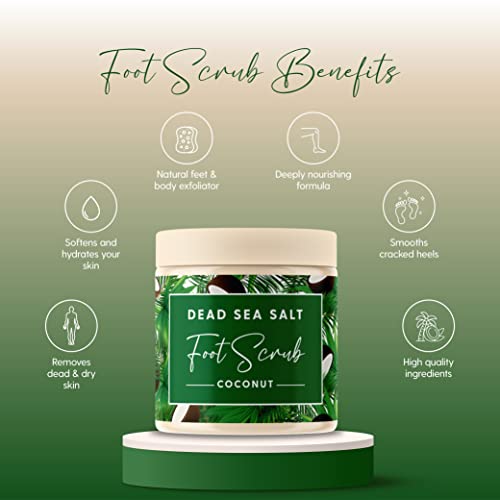 - MOISTURISES AND SOFTENS: This all-natural coconut oil and dead sea scrub utilizes the mineral-rich dead sea salt and the natural anti-fungal properties of the coconut oil to remove dead and dry skin, foot odour, smooth cracked heals, as well as to soften and hydrated your skin.