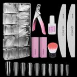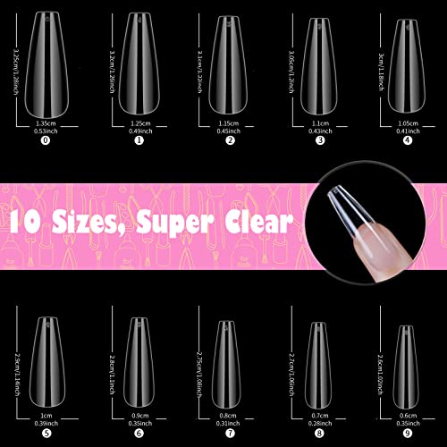 - All in one tips nails set: 500 pieces coffin nail tips in 10 different sizes, suitable for most fingers. Coming with 1 x brush-on nail glue(10g), 1 x nail clipper, 2 x nail files 100/180, 2 x nail buffer blocks 120, 1 x nail brush.