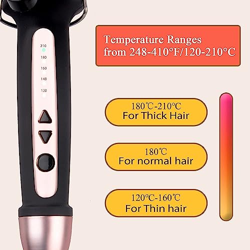 - ✅TEMPERATURE CONTROL: Our curling iron achieve stable heating and precise temperature adjustment from 120 ℃ ~ 210 ℃, which may suit thin, normal even thick, coarse hair conveniently. 120°C~ 160 ℃ recommended for thin hair, 180 ℃ recommended for normal hair, 180°C~ 210 ℃ recommended for thick and stiff hair.