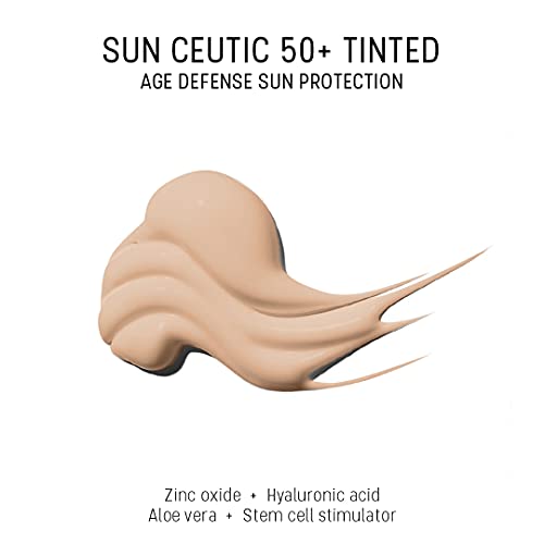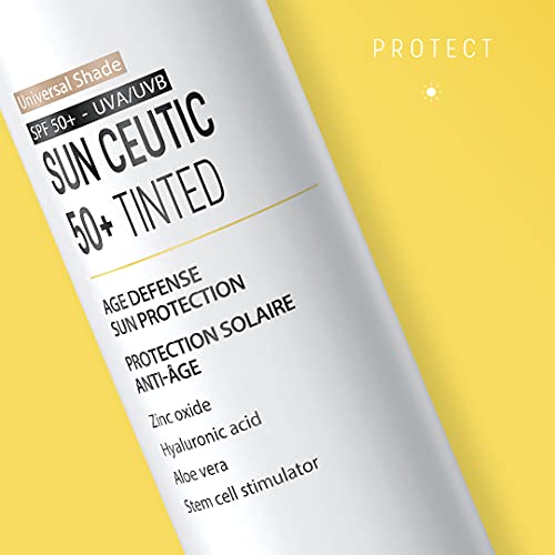 - HIGH SUN PROTECTION AND EVEN COMPLEXION: Sun Ceutic 50+ Tinted provides very high protection for skin exposed to UV rays and helps prevent premature skin aging. The skin is protected from visible signs of photoaging. Tinted sunscreen evened the complexion out. Great for anyone who suffers from an uneven skin tone and wants to protect themselves from further sun damage while looking radiant.
