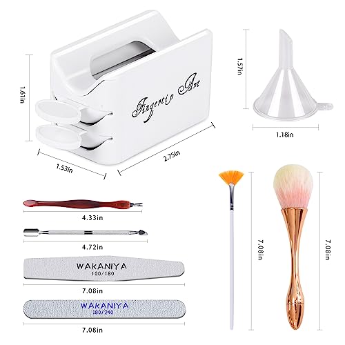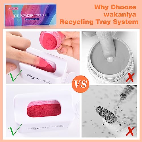 - WAKANIYA DIP POWDER NAIL TOOLS KIT : You can get 1×dip powder recycling tray, 1×funnel, 1×nail powder brush, 1×100/180 grit nail files , 1×180/240 grit nail files , 1×stainless-steel cuticle pusher, 1×cuticle trimmer, 1×fan brush. Perfect complete nail art tools for home and salon use.