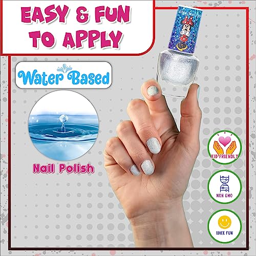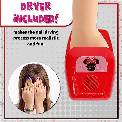 - Kit includes: 8 non-toxic, peelable nail polishes: pink shimmer, pink opaque, 2 pink metallic, green opaque, light blue opaque, Prussian blue, and blue. 1 Disney Minnie Mouse nail dryer. DRYER INCLUDED: After polishing, your little one can dry her nails in a cool, portable nail dryer! NON-TOXIC NAIL POLISH: No harsh chemicals used, with children’s safety always at the top of mind.