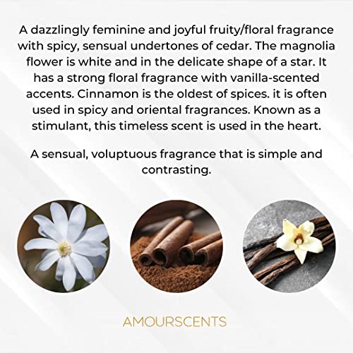 - FRESH AND SENSUAL - A dazzlingly feminine and joyful fruity/floral fragrance with spicy, sensual undertones of cedar. The magnolia flower is white and in the delicate shape of a star. It has a strong floral fragrance with vanilla-scented accents. Cinnamon is the oldest of spices. it is often used in spicy and oriental fragrances. Known as a stimulant, this timeless scent is used in the heart. A sensual, voluptuous fragrance that is simple and contrasting