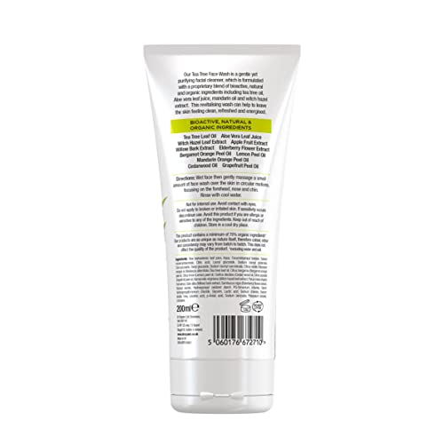 - Our Tea Tree Face Wash is a gentle yet purifying facial cleanser, which is formulated with a proprietary blend of bioactive, natural and organic ingredients including tea tree oil, Aloe vera leaf juice, mandarin oil and witch hazel extract