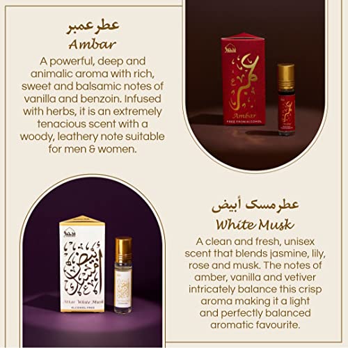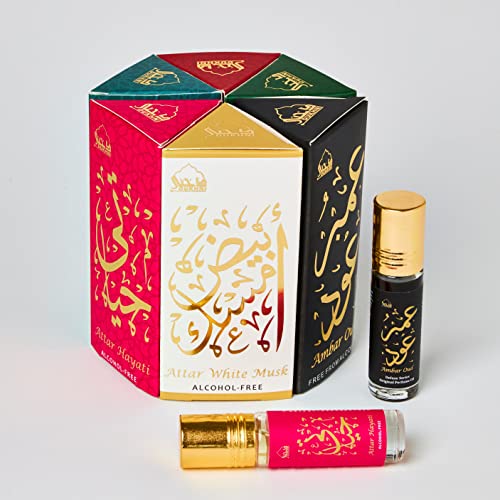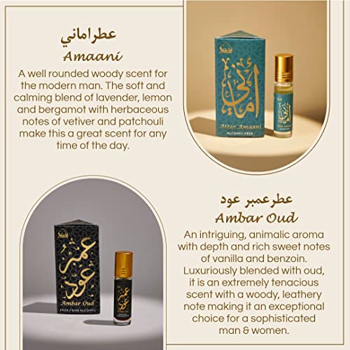 - CONTENTS: 6 Bottles x 6ml Attar Oils- Amaani, Ameerah, Hayati, Ambar, Ambar Oud, White Musk (0.2 fl Oz each) | AMAANI عطراماني- A well rounded woody scent for the modern man. The soft calming blend of lavender, lemon & bergamot with herbaceous notes of vetiver & patchouli make this a great scent for any time of the day | AMEERAH عطراميرة- A pure sensual fragrance designed for both men and women. Clean & contemporary with a refreshing green tea scent intertwined, this is an all time favorite
