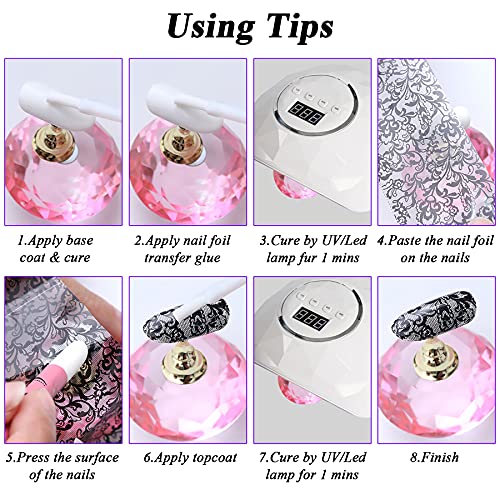 - Easy to use: apply the foil glue and wait for 5 min (make sure the foil glue turns clear); cut a piece of the nail foil and press it on your nail; peel the backing off and the pattern will transfer on your nail