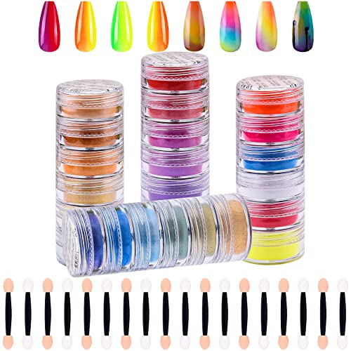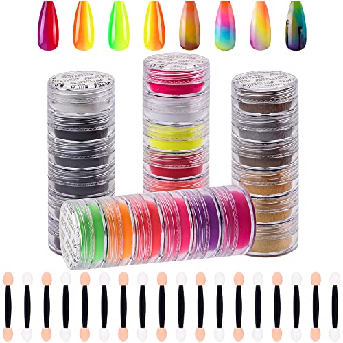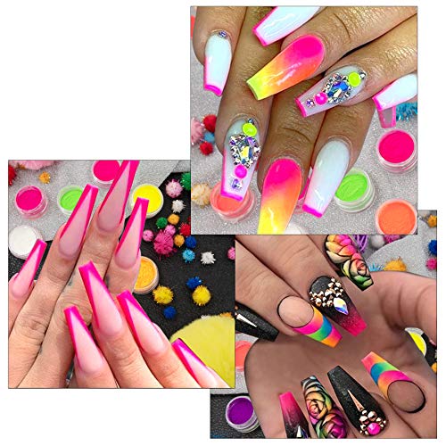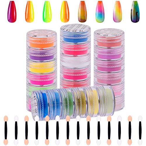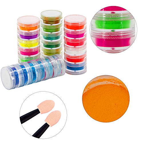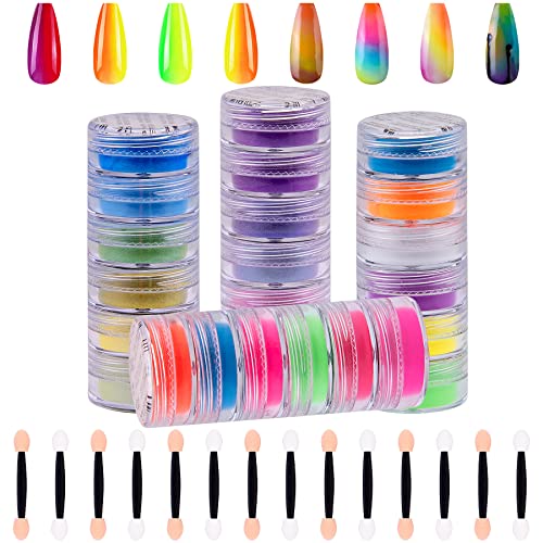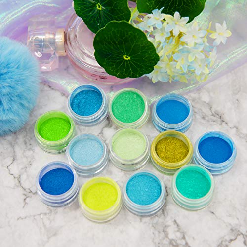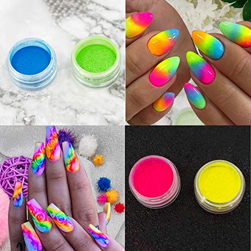 - Package includes: come with 24 bright colours nail pigment powder including 12 fluorescent colours and 12 blue and green nail powders which also added with pearl powder and can be used as eye shadow. (please note that the pigment powder won't glows in the dark)