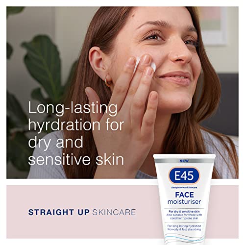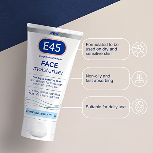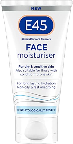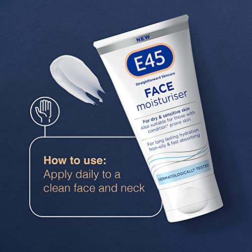 - DERMATOLOGICALLY TESTED – E45 Face Moisturiser is dermatologically tested and has been specifically formulated for facial skin. It is a gentle formula that is suitable for dry, sensitive skin. E45 Face Moisturiser is also suitable to those prone to eczema and dermatitis. To use, simply apply to a clean face and neck. We would recommend preparing your skin first withE45 foaming cleanser for best results.