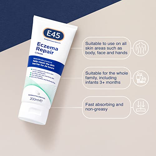 - HYDRATING INGREDIENTS - The Omega 3 fatty acids in our cream help repair the skin barrier and keep the skin hydrated for 24 hours, and the cream also provides a protective layer that helps to lock in moisture and keep irritants out to avoid triggering new flare ups. Our perfume-free E45 Eczema Repair cream is suitable for the whole family and for infants over 3 months. To use, apply the cream liberally and frequently, at least 2-3 times daily, onto your skin.