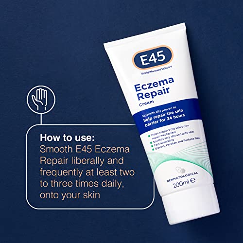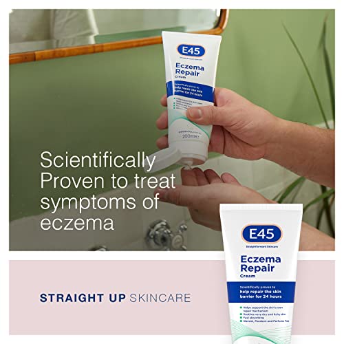 - TRIPLE-ACTION FORMULA – E45’s Eczema Repair Cream is a scientifically proven emollient cream with a triple-action formula that is designed to treat the symptoms of eczema. It contains a high level of humectants to draw water in, occlusive agents to help reduce water loss, as well as omega fatty acids which may help support the integrity of the skin. Our Eczema Repair Cream soothes and hydrates very dry and itchy skin.