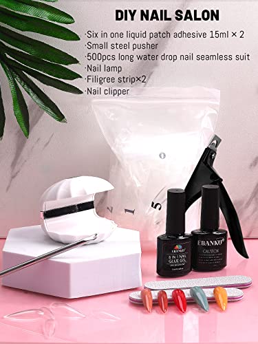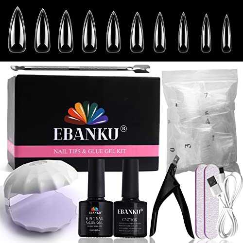 - 【EBANKU Nail Tips & Glue Gel Kit】Our long nail tip & glue gel kit includes 2PCS 15ML 6 in 1 nail glue gel, 240PCS almond nails tips & 200PCS Coffin nail, 2PCS nail file, 1PCS portable UV LED nail lamp, nail clipper and double-sizes cuticle pusher. You can easily extend your nails and enjoy the fun of DIY salon!