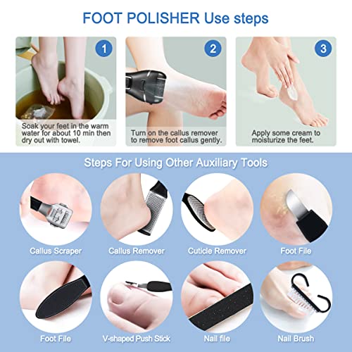 - Electric Callus Remover Foot File: Electric foot pedicure kit including 3 different quartz sand grinding heads and stainless steel coarse file, stainless steel fine file, foot file, cuticle fork, callus scraper, etc. A complete callus remover foot care kit to meet your different needs.