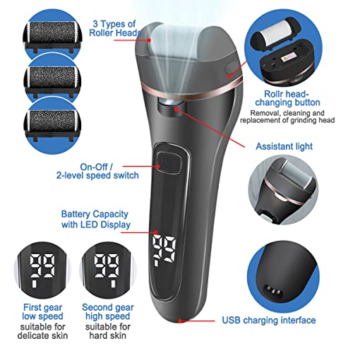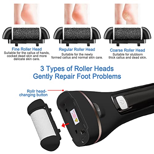 - 3 Different Replacement Roller Head: The electric foot callus remover has three removable roller heads. Fine roller head is suitable for daily foot care. Regular callus roller head suitable for non serious dead skin and calluses. Thick callus roller head suit for stubborn horny dead skin and crack. You can choose a roller head of a suitable specification according to your calluses.