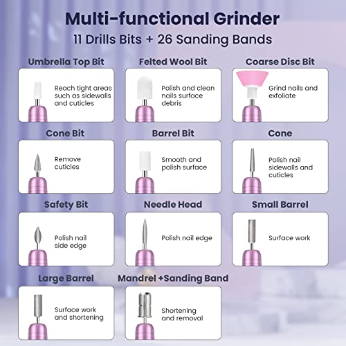 - Professional Nail Drill Machine: Our upgraded nail drill includes 11 drill bits, 1 brush, 1 glass nail file, and 26pcs sanding bands. Ergonomic design gives comfortable and firm grip which is perfect for professional nail technicians, as well as for those looking to perfect their nail care at home.