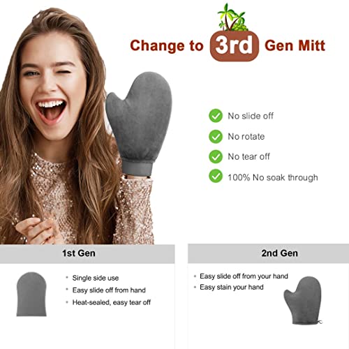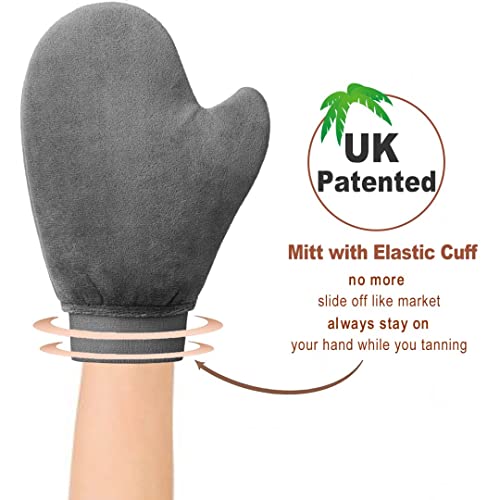 - UK PATENT 3rd-Gen No Fall Off Self Tanning Mitt: This 3rd-Gen fake tan mitt have BOTH elastic wristband and thumbhole design, it gives you extra control and doesn't allow the tanning mit to slide off. The update is based on numerous customer feedback analyses, the most complaint about 2rd-Gen (without elastic band) is the self tan mitt falls off-hand while applying self tanner, so we add an elastic wristband design for the 3rd-gen, it ensures tanning glove always stay on your hand, NO FALL OFF!